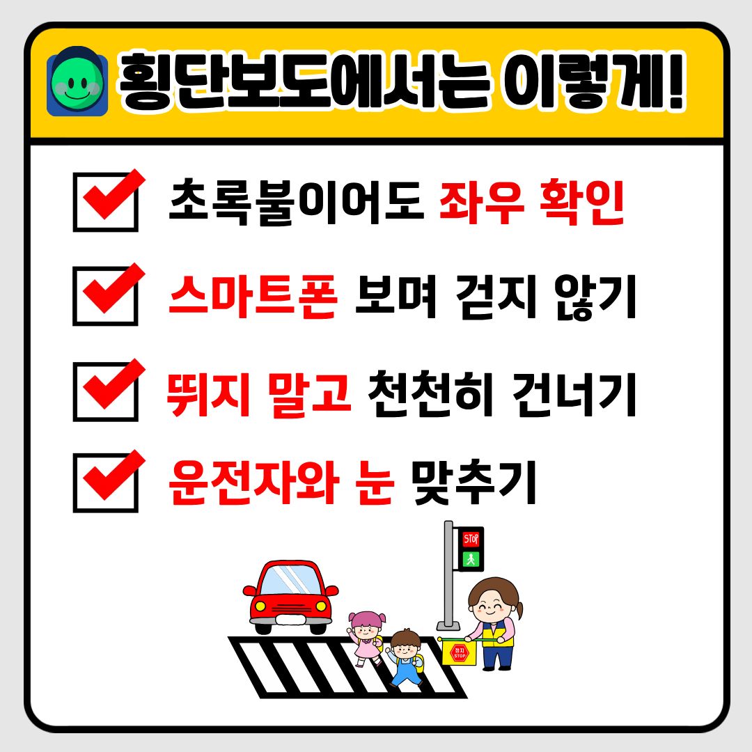 보행 중 스마트폰은 잠시 멈추고, 횡단보도에서는 꼭 좌우 확인!